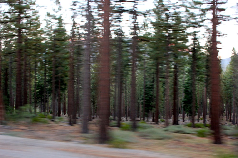on the way up to tahoe. the log cabin with the blue roof nestled in the pines.